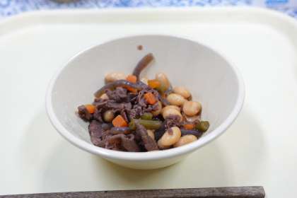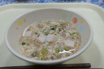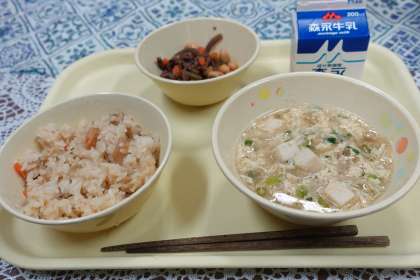 今日の献立は、かきたま汁、五目豆、かやくご飯、牛乳です。