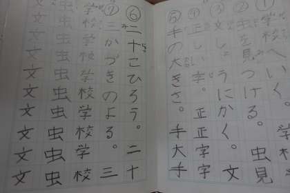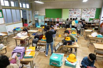 写真は朝の準備をする1年1組、2組です。宿題もていねいに頑張りました。