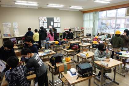 朝の準備をする5年1組、2組です。