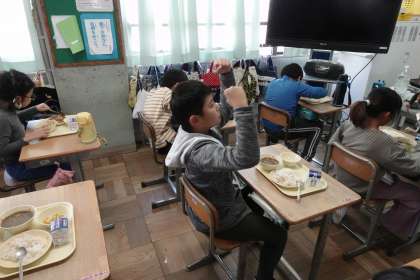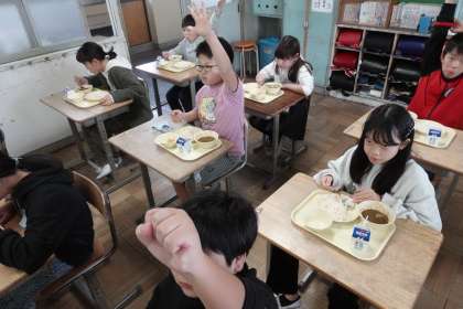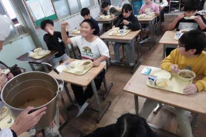 4年2組です。シーフードカレーをめぐる争奪戦が始まっていました。