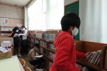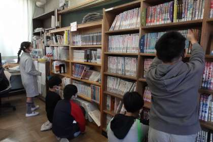 図書室を利用する5年2組です。司書の先生が、色々アドバイスをしてくださいます。