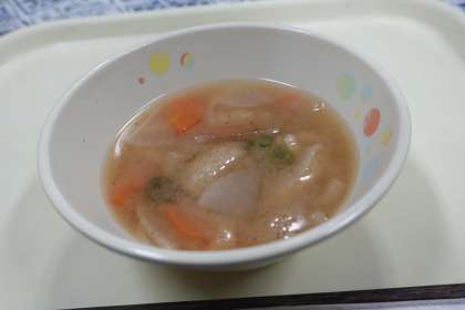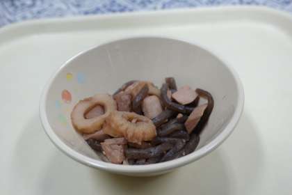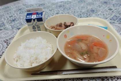 今日の献立は、みそ汁、ご飯、マグロのやまと煮、牛乳です。