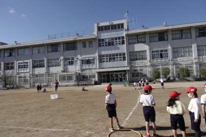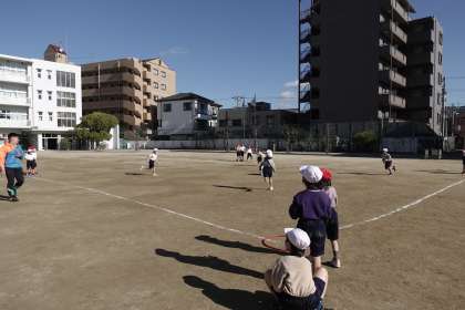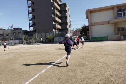 校長室に楽しそうな声が聞こえてきました。グラウンドをのぞきに行くと、1年2組がクラスレクを楽しんでいました。