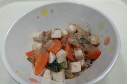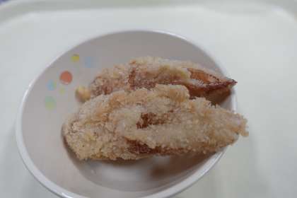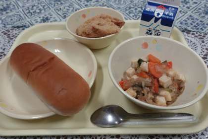 今日の献立は、豆腐チャンプル、ちくわフライ、ハニーパン、牛乳です。