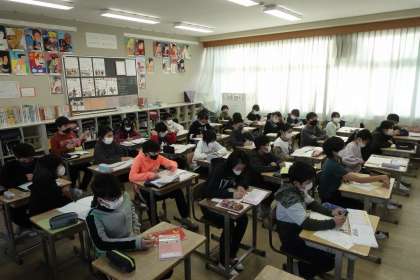 5年1組と2組です。2組が勉強していますが、このあとすぐテストがあるそうです。頑張ってくださいね。