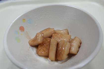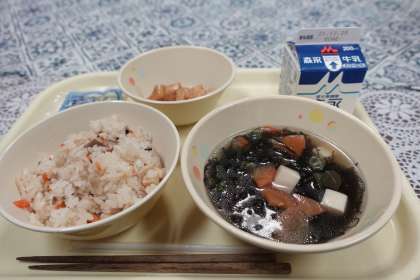 今日の献立は中華おこわ、もずくスープ、イカの照り煮、ミニフィッシュ、牛乳です。