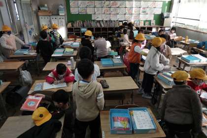 朝の準備をする2年1組です。