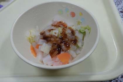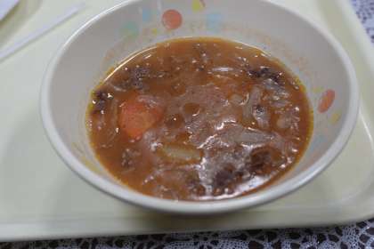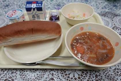 今日の献立は、ビーフシチュー、冬野菜のサラダ、コッペパン、牛乳、和風ドレッシング、ヨーグルトです。ビーフシチューは子どもたちにも大人気です。