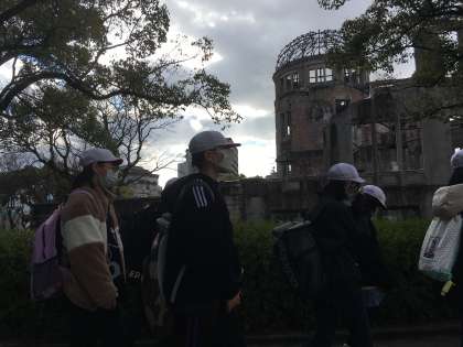 今から被曝体験をお聞きします。平和学習の始まりです。広島は曇り空で少し雨がパラパラしています。