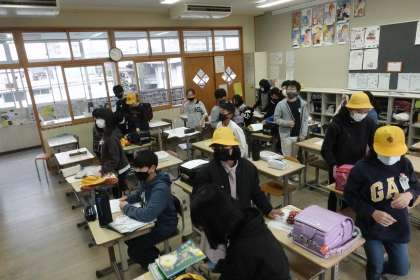 朝の準備をする5年1組です。(2組は更衣中でした)