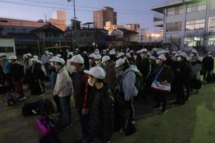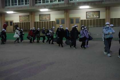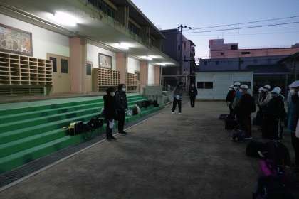 一日目の出発式です。朝早かったのでまだ薄暗いですね。