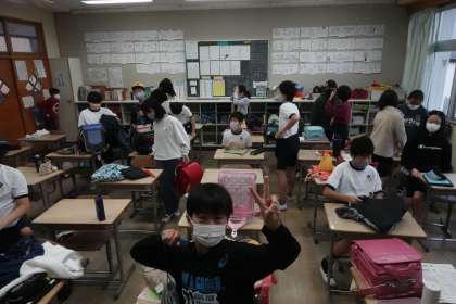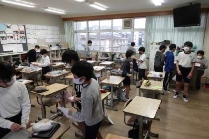 写真は朝の準備をする6年生です。みんな元気です。