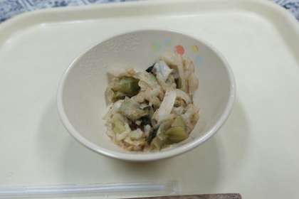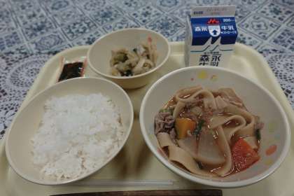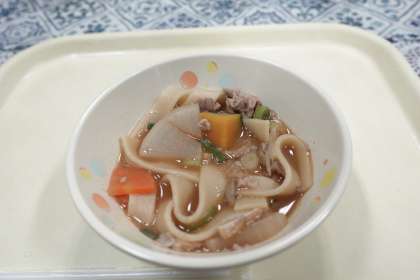 今日の献立は、ほうとう、ご飯、おひたし、のり、牛乳です。今日は冬至なので、カボチャがたっぷり入ったほうとうが行事食として献立になりました。