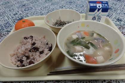 今日から給食がスタートしました。今日の献立は、赤飯、田作り、雑煮、みかん、牛乳です。今日の献立は、新年を祝う献立です。