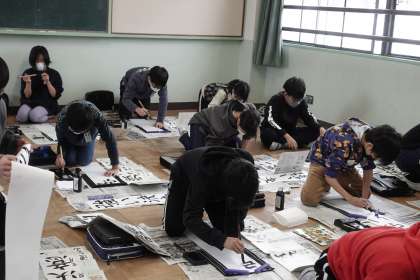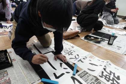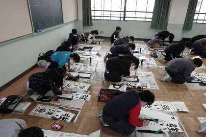 5時間目の様子です。多目的室で5年2組が書初めを行っていました。