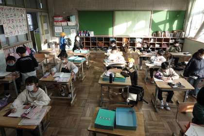 朝の準備をする1年生です。いつも気持ちのいい挨拶をしてくれます。