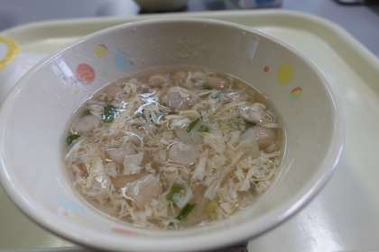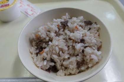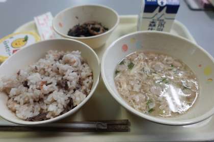 今日の献立は、肉飯、かきたま汁、ひじきの炒め煮、柚ゼリー、牛乳です。