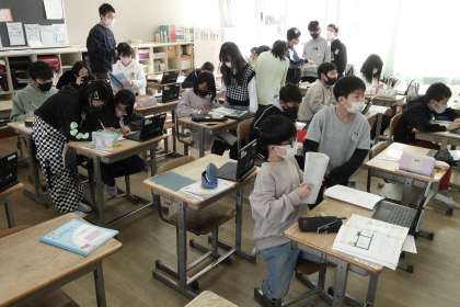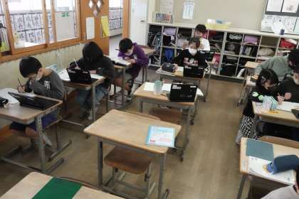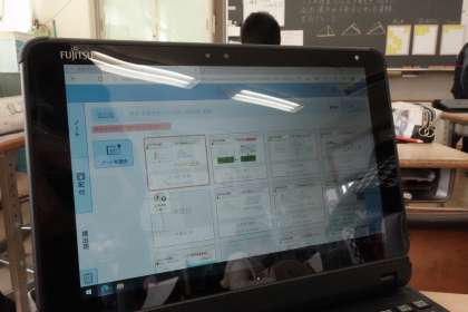 5年1組の授業です。午前中の2組と同じくICTを活用した授業です。自分の考え方を説明し、お互いの考え方を共有することにより、一層自分の考え方を深めることにつながります。