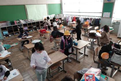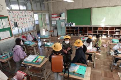 写真は朝の準備をする1年生です。