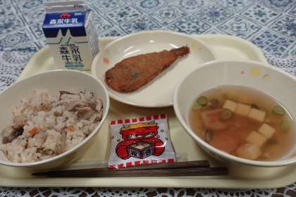 今日の献立は、かやくご飯、いわしフライ、すまし汁、福豆、牛乳です。