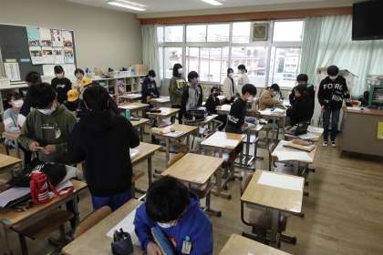 写真は朝の準備をする6年1組、2組です。