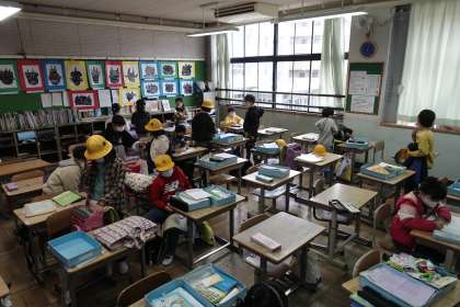 朝の準備をする2年1組です。