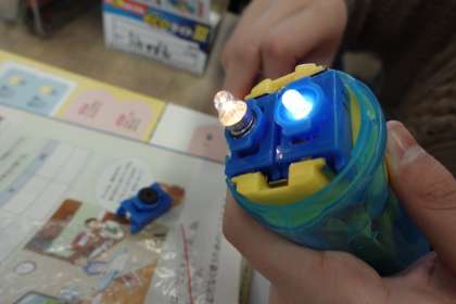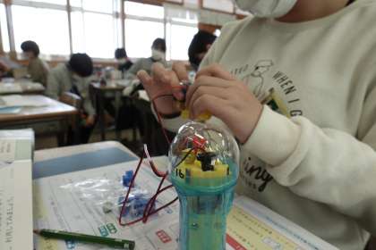 6年2組の理科です。電球と発光ダイオードの光り方、発熱量の違いを比較し、どちらが効率的に光るかを考えています。