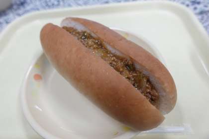コッペパンに切り目が入っていて、ミートサンドを挟んで食べます。とてもおいしいです。