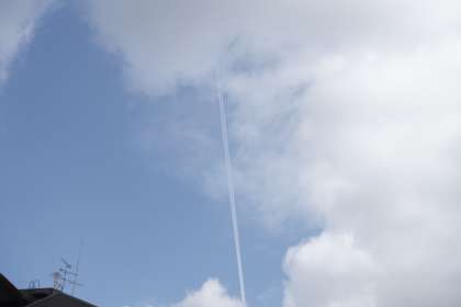 何人もの児童が、空を見上げて教えてくれました。写真ではわかりにくいのですが、鮮やかな飛行機雲です。