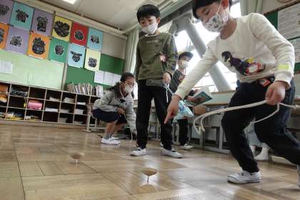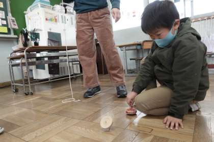 1年1組です。図工で作ったこまを回しました。