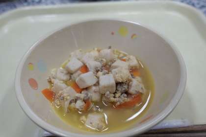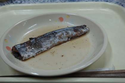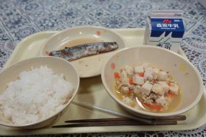 今日の献立は、サンマの煮つけ、いり豆腐、ご飯、牛乳です。