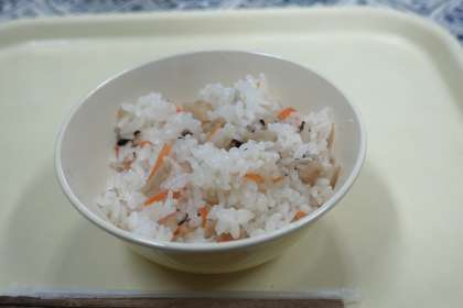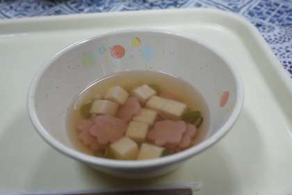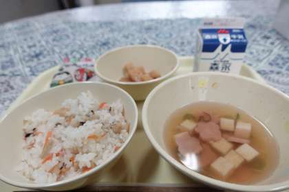 今日の献立は、ちらしずし、イカの照り煮、すまし汁、ひなあられ、牛乳です。ひな祭りに合わせた献立に感謝します。