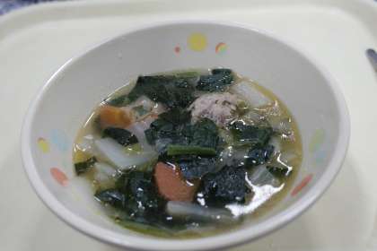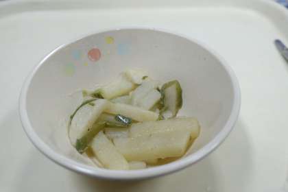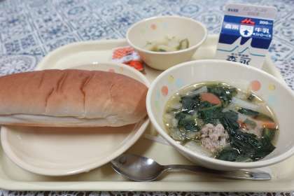 今日の献立は、白菜と肉団子のスープ、ジャガイモソテー、コッペパン、ミルクバター、牛乳です。