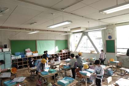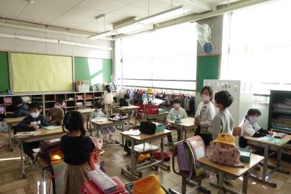 写真は朝の準備をする1年生です。