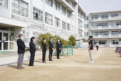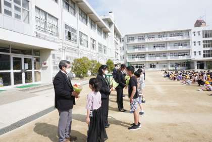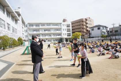 児童会代表からのあいさつ後、お世話になった先生方にお花をお渡ししました。いつまでも住道北小学校のことを忘れないでください。