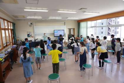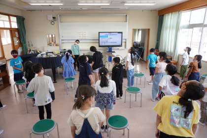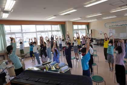 4年2組の音楽の授業です。体操教室ではありません。発声するためのウオーミングアップです。