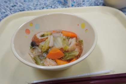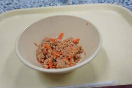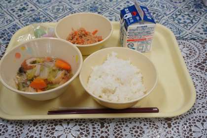 今日の献立は、きりたんぽ風、ツナ大豆ふりかけ、ご飯、花見団子、牛乳です。