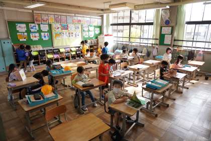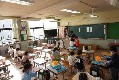 朝の準備をする1年2組です。