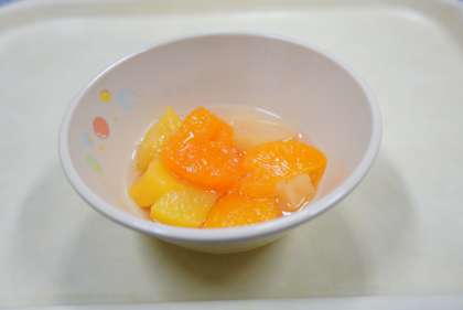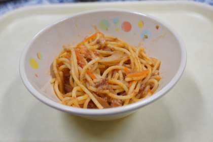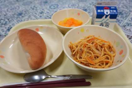 今日の献立は、スパゲティミートソース、ベビーパン、フルーツミックス、牛乳です。