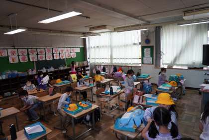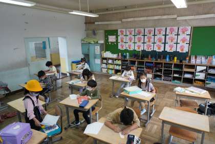 朝の準備をする2年1組、2組です。