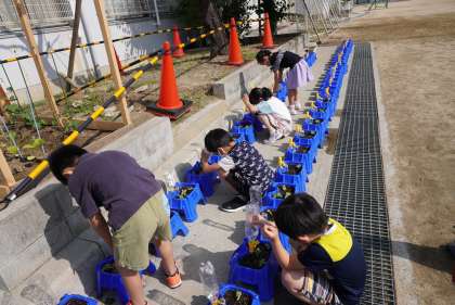 写真は朝の準備をする1年生です。朝顔がどんどん大きくなってきました。