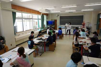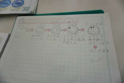 5年1組です。メダカの卵を観察しています。「目」がはっきり確認できました。