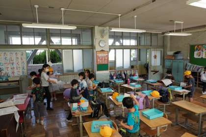 写真は朝の準備をする1年1組と2組です。家庭学習も頑張っていますね。