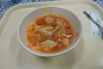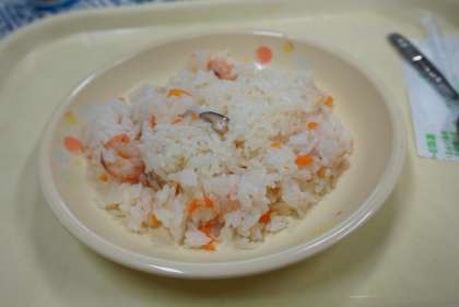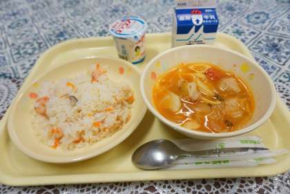 今日の献立は、エビピラフ、トマトミートボールスープ、ヨーグルト、牛乳です。子どもたちに人気のメニューが続きます。