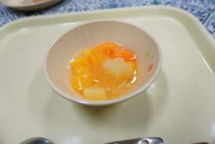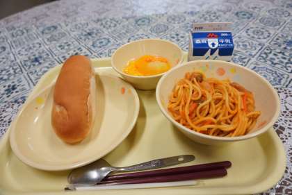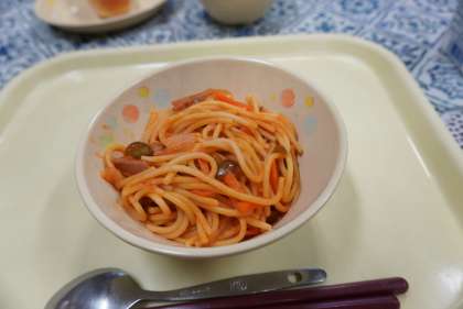 今日の献立は、スパゲティナポリタン、ベビーパン、フルーツカクテル、牛乳です。子どもたちに大人気のメニューです。