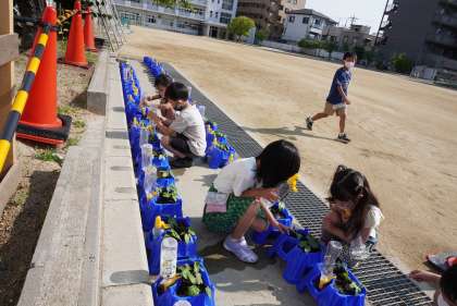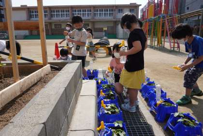 さっき遠足から戻ってきましたので、他学年の写真もアップします。今朝の水やりです。
