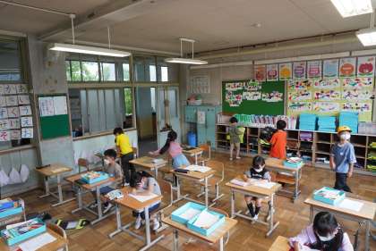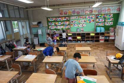 写真は朝の準備をする1年生です。今日も頑張りましょう。