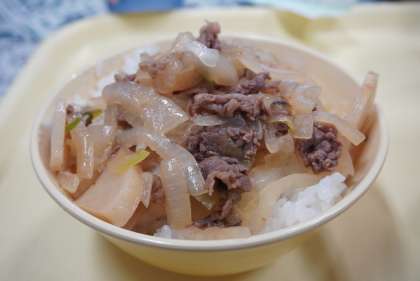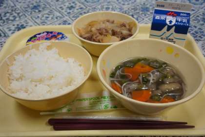 今日の献立は、牛丼、そうめん入りすまし汁、七夕ゼリー、牛乳です。