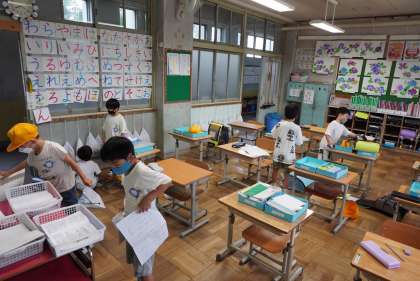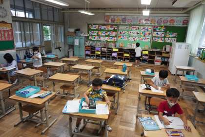 朝の準備をする1年1組と2組です。