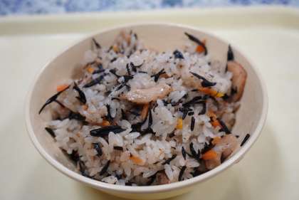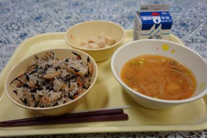 今日の献立は、ひじきご飯、みそ汁、高野豆腐の含め煮、牛乳です。